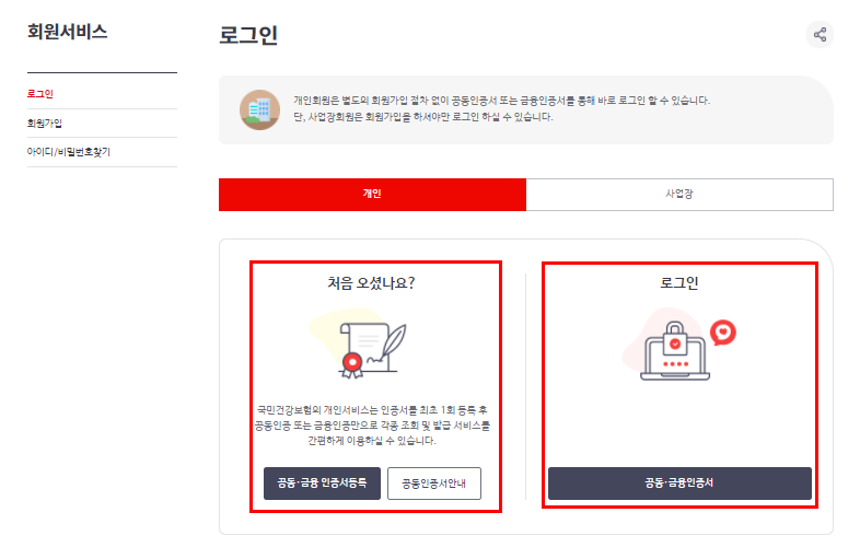 2. 로그인을 진행해주세요. 개인회원은 별도의 회원가입 절차 없이 공동 인증서 또는 금융인증서를 통해서 바로 로그인이 가능합니다. 단 사업장 회원은 회원가입을 하셔야만 로그인이 가능합니다.