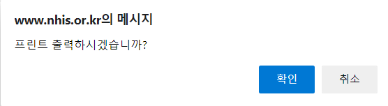 4-1. 프린트 발급을 누르시면 해당화면과 같은 창이 뜨게 됩니다. 확인을 눌러주세요. 누르시면 발급 창이 나오게 됩니다. 만약에 아무것도 나오지 않는다면, 팝업창이 차단되었다고 오른쪽 상단에 x표시가 나오는데 허용으로 바꿔주시면 됩니다.