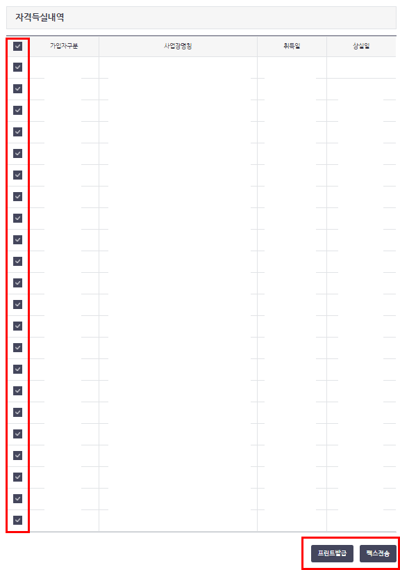 4. 조회를 누르시면 다음과 같이 자격득실 내역 확인이 가능합니다. 본인의 가입자 구분, 사업자 명칭, 취득일, 상실일, 확인이 가능합니다. 또한 체크 표기를 통해서 본인이 해당하는 부분만도 출력이 가능합니다.