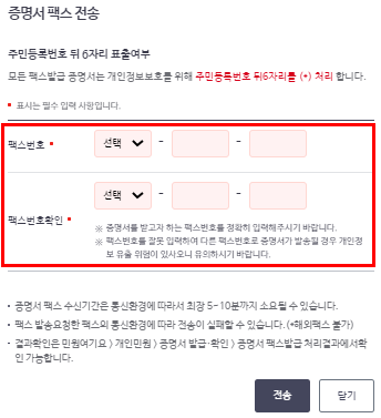 4-2. 팩스 전송을 누르시면 바로 팩스도 전송이 가능합니다. 팩스번호, 팩스번호 확인에 보내고자 하는 번호를 동일하게 입력해주세요. 입력을 다하신 후 전송 버튼을 눌러시면 처리가 완료됩니다. 별도로 증명서 팩스 수신기간은 통신환경에 따라서 최장 5~10분까지 소요될 수 있으며, 팩스 발송 요청한 팩스의 통신환경에 따라 전송이 실패할 수 있습니다. 해외 팩스는 전송이 불가합니다. 결과 확인은 민원 여기요 → 개인 민원 → 증명서 발급. 확인 → 증명서 팩스발급 처리결과에서 확인이 가능합니다.