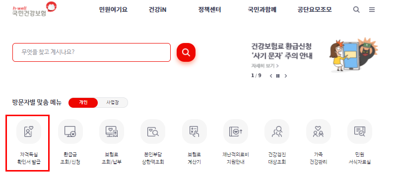 자격득실 확인서 발급을 위해서 먼저 국민건강보험 홈페이지에 접속해주세요.