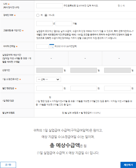 * 표기된 부분은 필수입력사항입니다. 나이, 고용보험 총가입기간, 마지막 근무일, 1일 소정근로시간, 월간평균임금 (세전금액)을 입력하신 다음 계산하기를 눌러주시면 결과 확인이 가능합니다. 일반 근로자와 별도로 일용 근로자는 마지막 근무일을 입력해주셔야 합니다.