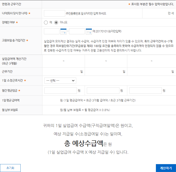 * 표기된 부분은 필수입력 사항입니다. 나이, 장애인여부, 고용보험 총 가입기간, 1일 소정근로시간, 월간 평균임금 (세전금액)을 입력해주신다음에 계산하기를 눌러시면 결과를 보실 수 있습니다.