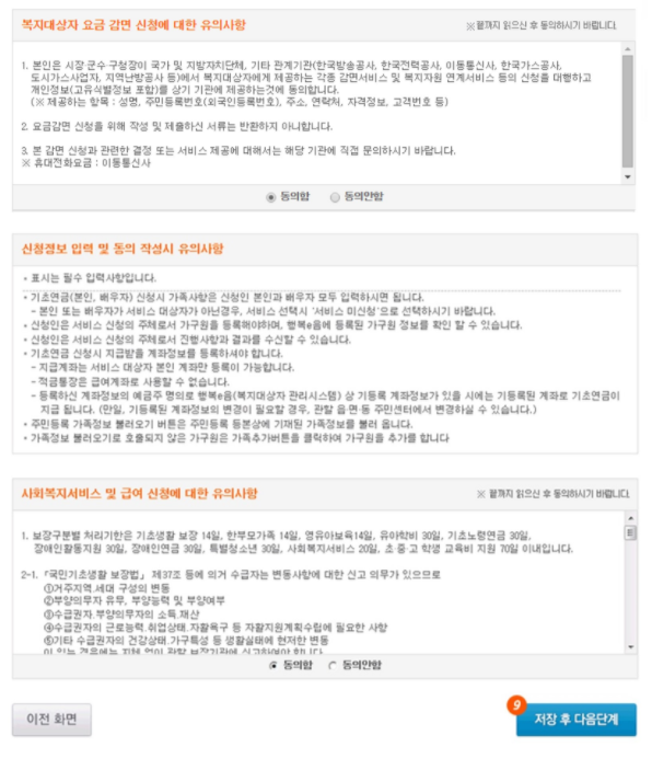 • 신청정보 입력 및 동의 작성 시 유의사항, 사회복지 서비스 및 급여 신청에 대한 유의사항을 확인 후 동의해주세요.