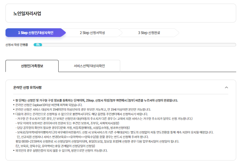 7. 신청인 입력을 다하시고 다음을 눌러주시면, 서비스 선택 대상 확인으로 넘어가게 되고 본인이 대상자 아닌지 확인이 가능합니다. 대상 여부 확인 후 다음을 눌러주세요. 이후 step 2 신청서 작성을 진행하시면 신청이 가능합니다.