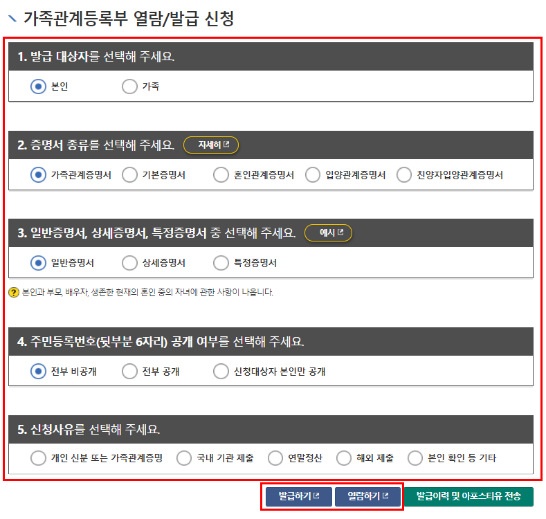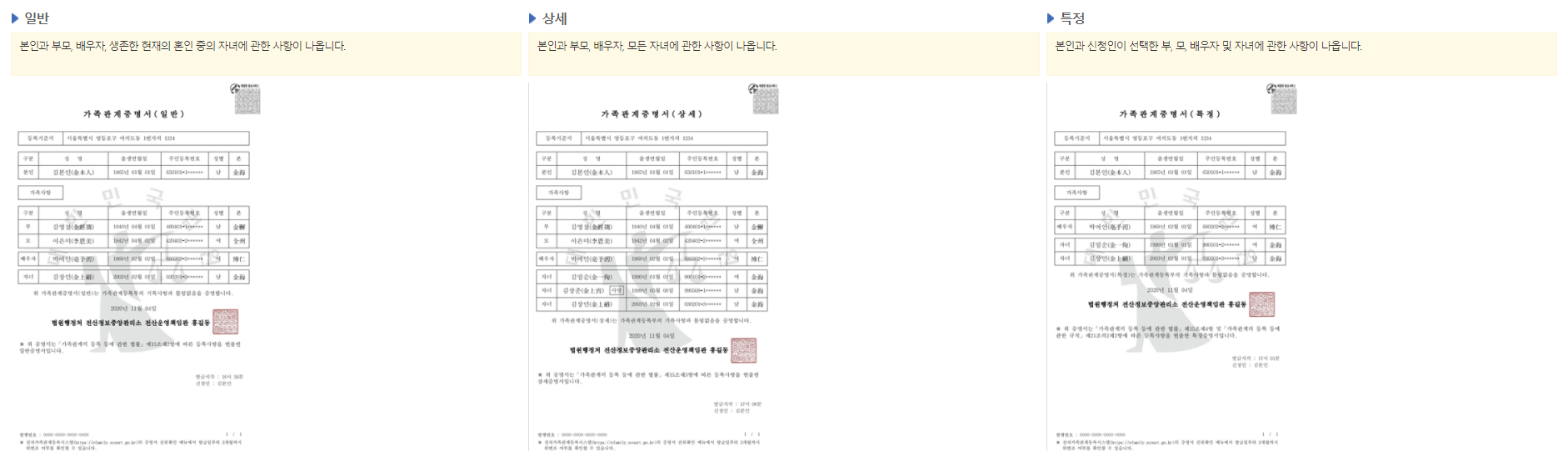 가족관계 증명서는 공통사항으로 본인의 등록기준지, 성명, 성별, 본, 출생연월일, 주민등록번호가 기재되어 발급이 가능하며, 별도로 일반, 상세, 특정 증명서로 발급이 가능합니다. (특정 증명서는 등록기준지, 본 포함 여부를 선택할 수 있습니다.)