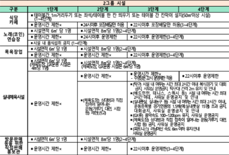| 2그룹 | 노래연습장, 식당.카페, 목욕장업, 방문판매 등을 위한 직접판매홍보관, 실내체육시설 (고강도.유산소) |