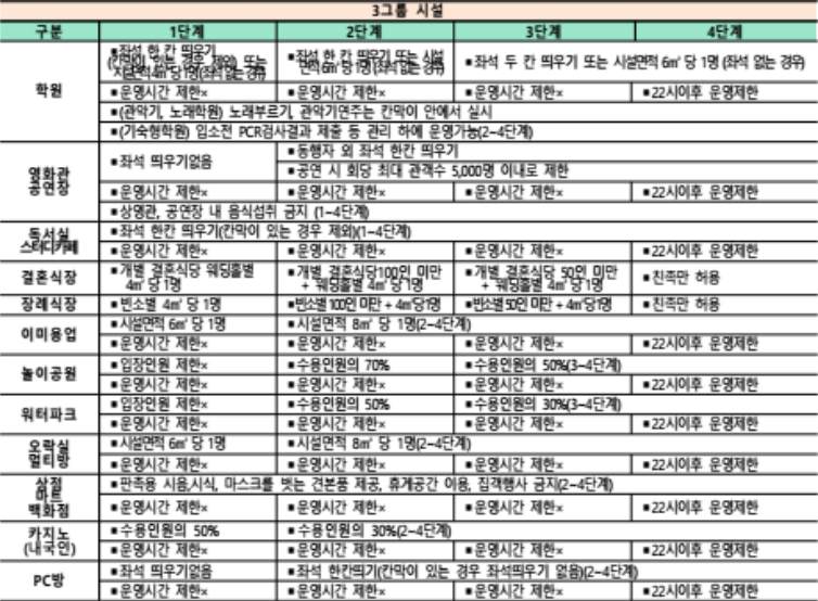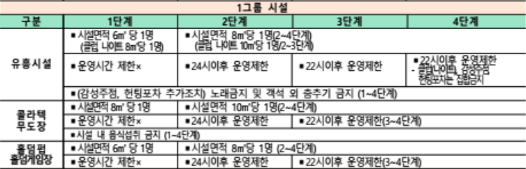 | 다중이용시설 | ● 이용인원 : 시설면적 8m2당 1명 (기본) * 콜라텍.무도장, 식당.카페 등 시설별 특성 반영하여 조정 ● 운영시간 : 일부 유흥시설(유흥, 단람주점 등), 노래연습장, 식당.카페, 실내체육시설, 영화관, PC방, 학원 등, 1~3그룹 22시 이후 운영 제한 ● 집합금지 : 클럽(나이트 포함), 헌팅포차, 감성주점 |