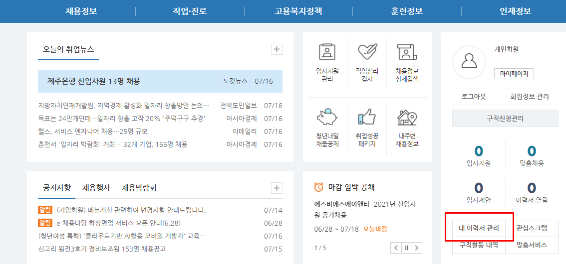 3. 로그인을 하신 후에 오른쪽 내 이력서 관리를 먼저 클릭하신 다음에 이력서를 작성해주세요.