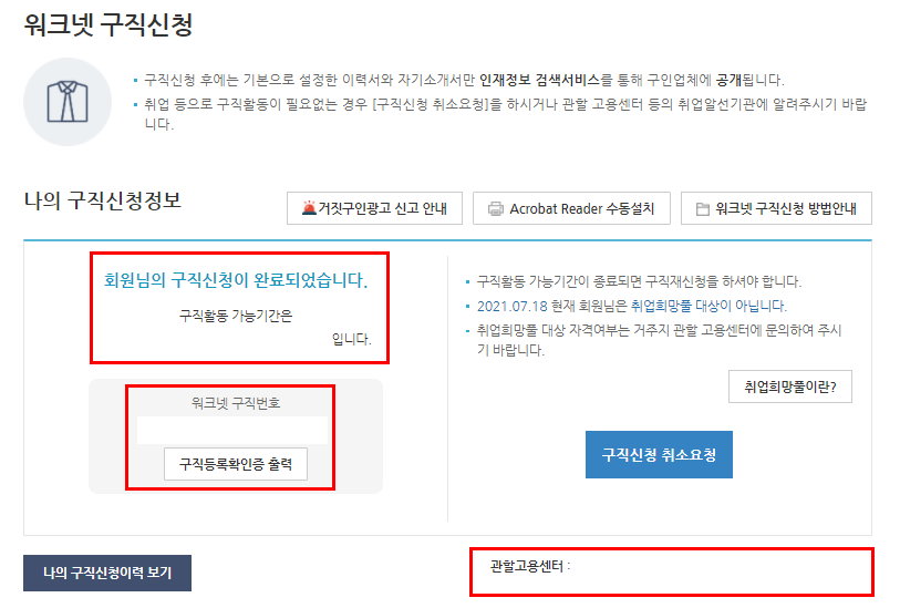 6. 구직신청 해당 내용을 입력하면 최종적으로 구직신청 완료 확인이 가능합니다. 이때 본인의 구직활동기간, 워크넷 구직 번호 및 구직등록확인증 출력도 가능하며, 관할고용센터 정보와 연락처 확인도 가능합니다.