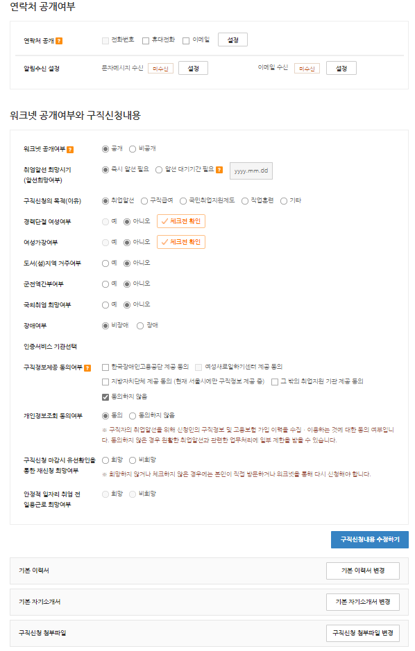 5. 구직신청에서 해당 내용을 체크해주세요. 이력서 나 자기소개서 변경을 원하시면 하단에서 변경이 가능합니다.