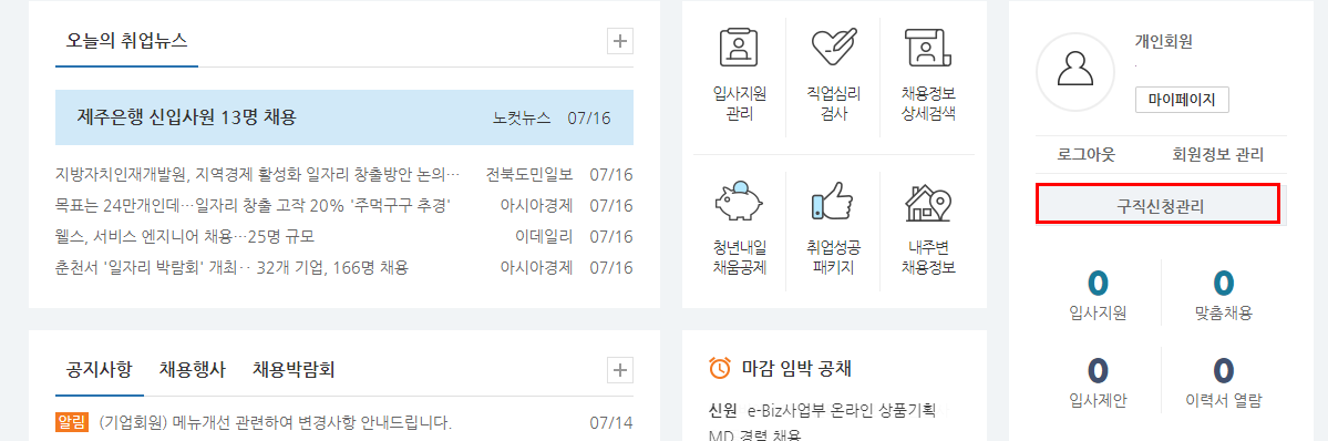 4. 이력서를 작성하신 후에 메인화면으로 나오셔서 구직신청관리를 클릭해주세요.