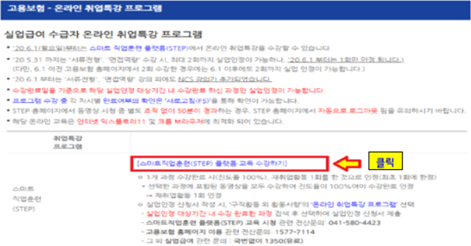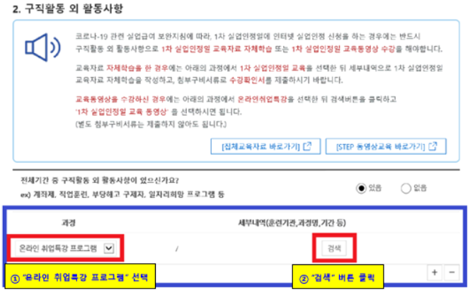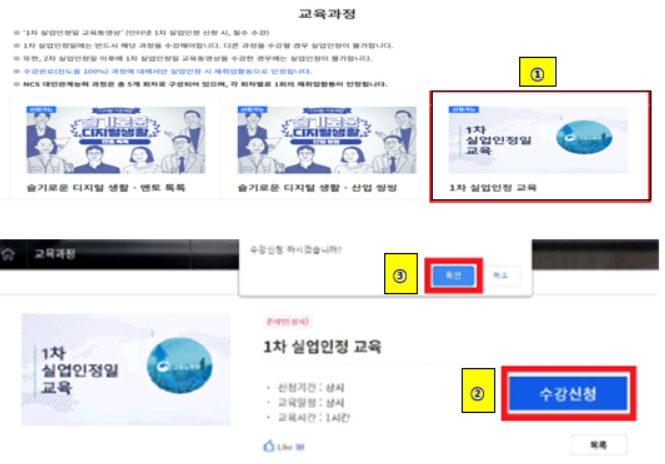| 1차 실업인정 | 2개 중 하나를 선택하여 실시하여야 합니다. | 1. 온라인 동영성 (STEP)에서 '1차 실업인정 교육 수강' |