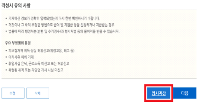 10. 확인한 작성내용이 맞는다면 임시저장을 클릭해주세요.