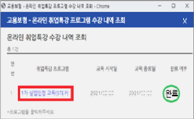 5. 클릭하시면 다음과 같은 팝업창이 나오게 됩니다. 팝업 창에서 파란색 글씨로 나와있는 1차 실업인정 교육(STEP)을 클릭해주세요. 만약 조회가 되지 않는다면 수강이 완료되지 않은 상태이며, 강의를 모두 들어야 수강이 완료되니 참고해주세요.