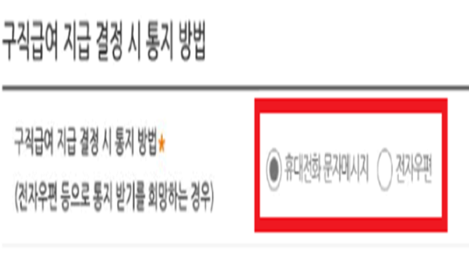 7. 구직급여 지급 결정 시 통지 방법 선택에서 원하시는 통지 방법을 선택해주세요. (휴대전화 문자메시지, 전자우편 방식이 있습니다.)