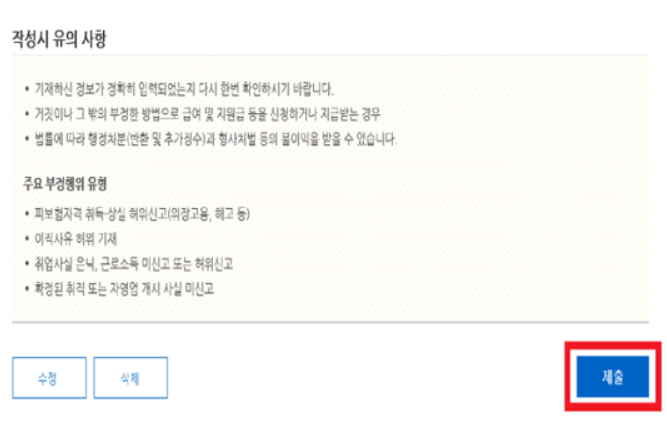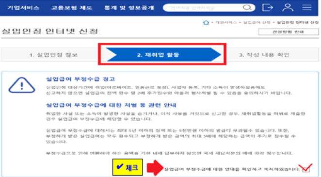 2. 재취업 활동에서 부정수급 안내문 확인을 해주신 후 체크를 클릭해주세요.