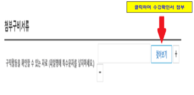 6. 팝업창으로 첨부 구비서류 창이 나오는데, 찾아보기를 클릭하신 다음 수강 확인서를 저장한 파일을 첨부해주세요.