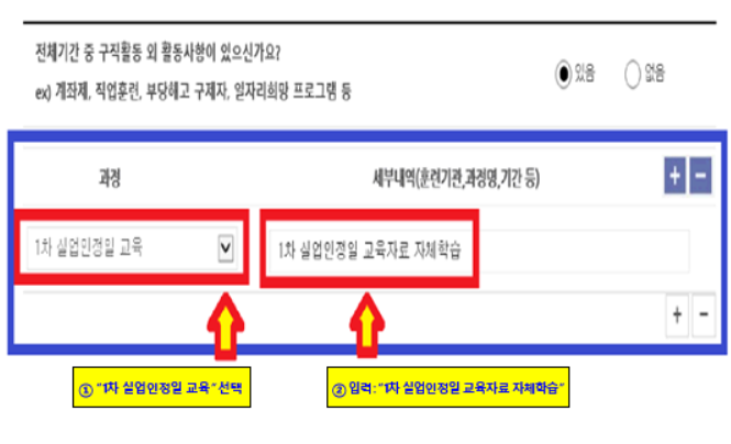 4. 구직활동 외 활동사항에서 있음 체크 시에 다음과 같은 화면이 나오게 됩니다. 해당화면에서 과정에서 1차 실업인정일 교육을 선택해주시고, 세부내역에 1차 실업인정일 교육자료 자체 학습이라고 입력해주세요.