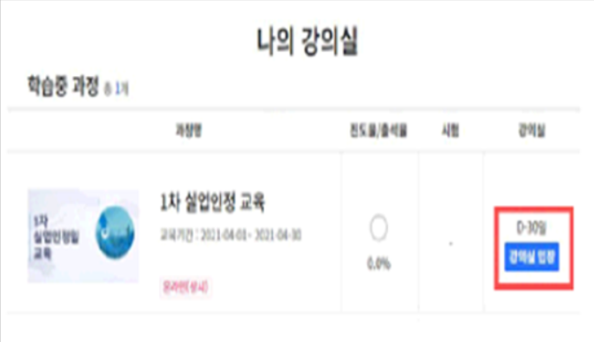 수강 가능 기간은 실업급여 수급자격 신청일부터 8일째 되는 날부터 1차 실업인정일 당일까지 가능합니다. 실업인정일 당일 오후 5시까지 실업인정 전송해야 하기 때문에 5시 전에 수강 완료가 필요하니 참고 바랍니다. 또한 지정된 기간 내 수강은 가능하나 실업인정 전송은 지정된 1차 실업인정일 당일만 가능합니다.