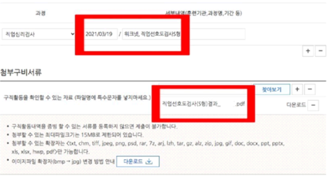10. 선택하신 후 직업심리검사 세부내용 기재 및 구비서류를 첨부해주세요. 세부내역에는 상단 예시와 같이 직업심리검사를 받은 날짜와 검사유형을 기재해주시고, 첨부 구비서류에는 직업심리검사 결과를 첨부해주세요. (워크넷에 PDF로 다운로드한 것)