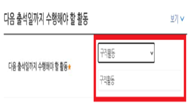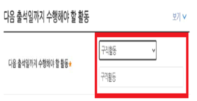 9. 첨부를 완료하신 후 다음 출석일 까지 수행해야 할 활동을 입력해주세요. 구직활동, 직업훈련 수강, 직업심리검사 등 다음 출석일까지 수행해야 할 활동을 선택하고, 구체적인 내용을 기재해주세요.