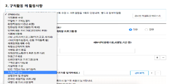 9. 구직활동 외 활동사항 있음 체크를 하시면 다음과 같은 화면이 나옵니다. 구직활동 외 활동사항에 직업심리검사 선택해주세요.