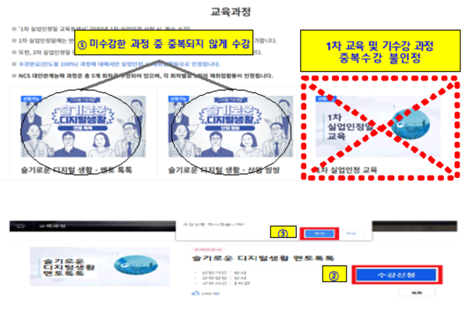 5. 스마트 직업훈련(STEP) 플랫폼 교육 수강을 진행해주세요. 1차 실업인정일 교육, 이전에 이미 수강한 교육과정을 중복 수강할 경우 실업인정을 받을 수 없으니 미수 강한 과정을 선택해주세요. 선택하신 후 수강신청 → 확인을 클릭해주세요.