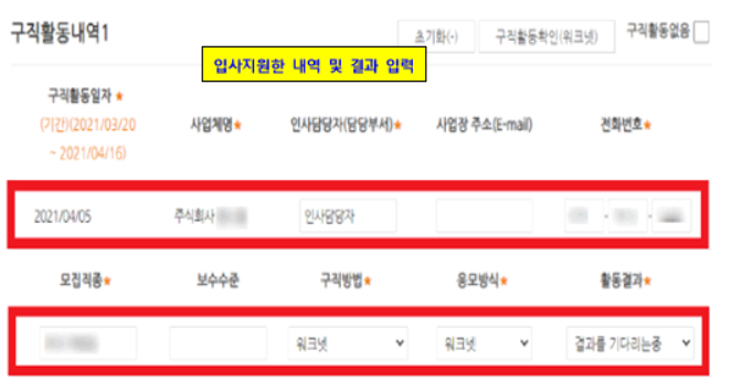 3. 구직활동 내역에서 있음을 선택해주세요. 선택하신 후 해당화면에서 구직활동일자, 사업체명, 인사담당자, 전화번호, 모집(지원) 직종, 구직 방법, 응모 방식, 활동결과를 입력하는 화면 확인이 가능합니다.