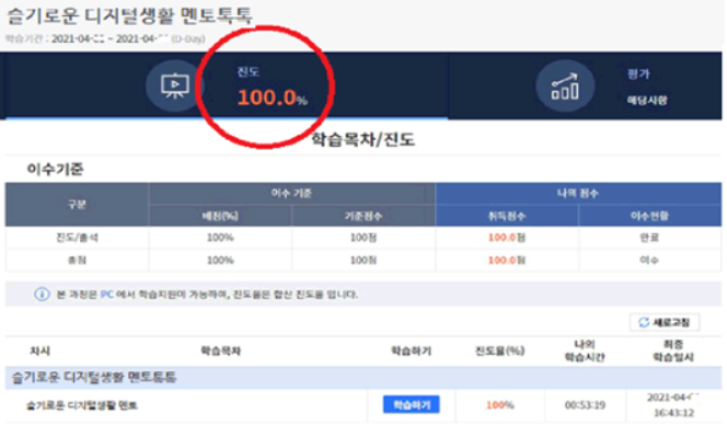 9. 동영상 교육 수강 완료 후 진도 100%가 되었는지를 확인해주세요.