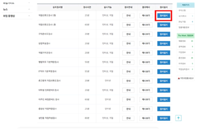 3. 원하는 심리검사를 택하여 검사 실시 클릭 후 실시를 진행해주세요.