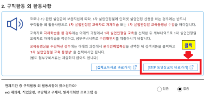 실업급여 1차 실업인정 신청 시 온라인 동영상 (STEP)에서 '1차 실업인정 교육 수강', 1차 실업인정 교육자료 자체 학습 2개 중 하나를 선택하여 진행하셔야 합니다. 1차 실업인정 절차 방법과 신청