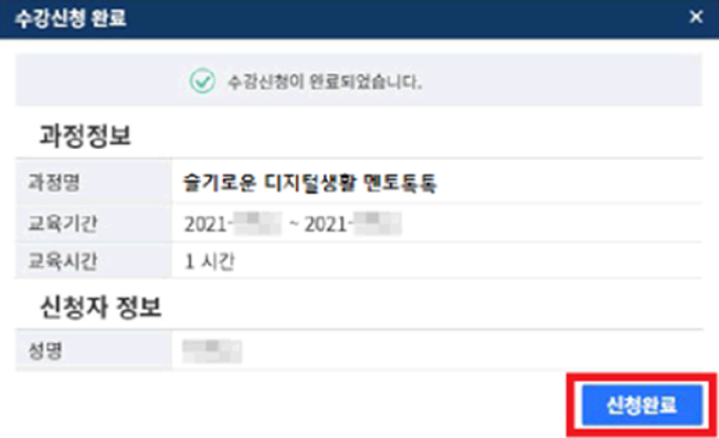 6. 해당 팝업창에서 수강신청 완료를 클릭해주세요.