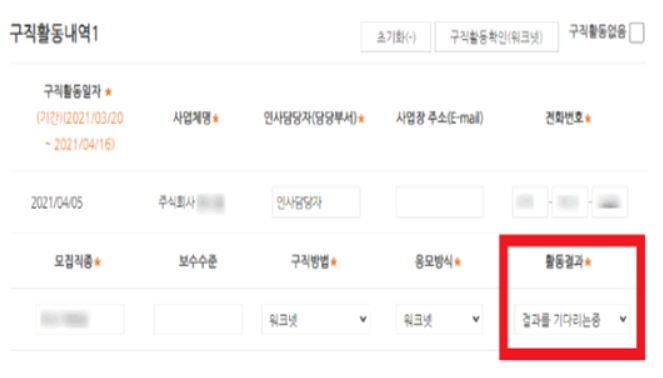 3. 구직활동 내역에서 있음을 선택해주세요. 선택하신 후 해당화면에서 구직활동일자, 사업체명, 인사담당자, 전화번호, 모집(지원) 직종, 구직 방법, 응모 방식, 활동결과를 입력하는 화면 확인이 가능합니다.
