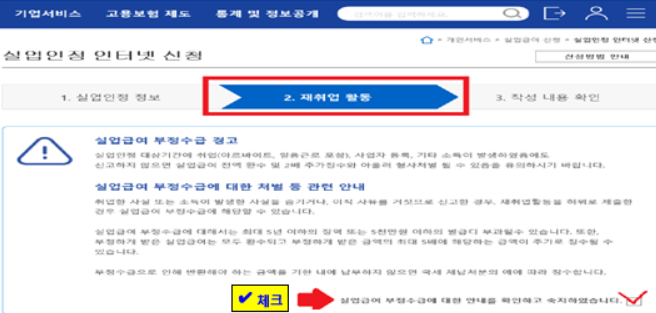 2. 재취업 활동 부정수급 안내문을 확인하시고 체크해주세요.