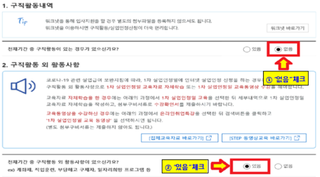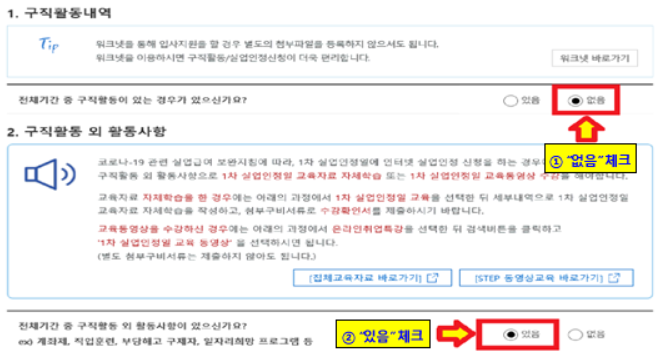 8. 구직활동내역은 없음 체크해주시고, 구직활동 외 활동사항에 있음을 체크해주세요.