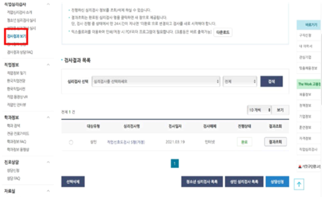 2. 로그인 후 직업 진로 → 성인용 심리검사 실시를 클릭해주세요.