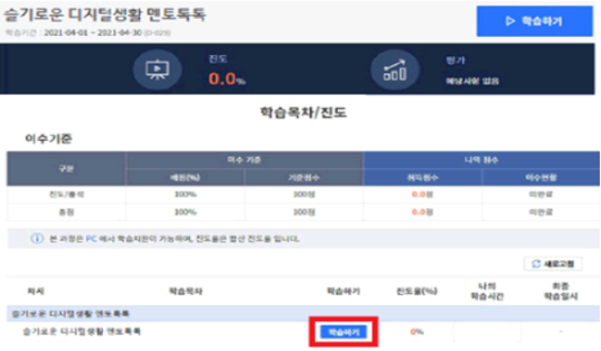 8. 수강 신청 한 동영상을 학습하기를 클릭하셔서 동영상 교육을 수강해주세요.