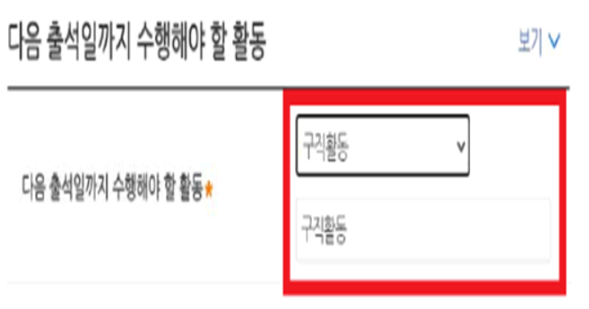 9. 첨부를 완료하신 후 다음 출석일 까지 수행해야 할 활동을 입력해주세요. 구직활동, 직업훈련 수강, 직업심리검사 등 다음 출석일까지 수행해야 할 활동을 선택하고, 구체적인 내용을 기재해주세요.