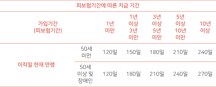 - 근로자와 동일하게 피보험기간 및 연령에 따라 120~270일간 지급합니다.