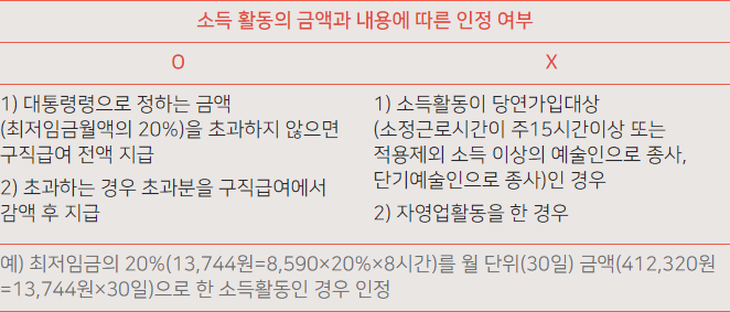 - 단 근로자와의 형평성을 고려하여 수급기간 중 소득활동을 인정하되, 소득활동 허용 기준은 고용노동부 장관의 고시에 따릅니다.