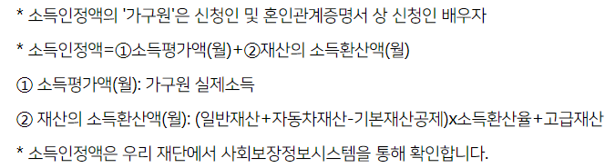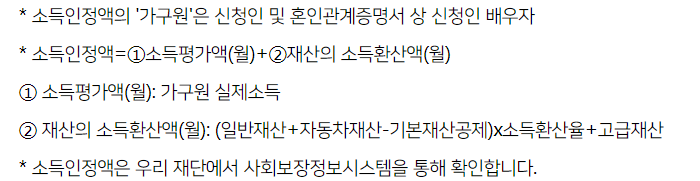 - 소득인정액 : 가구원 소득인정액이 기준 중위소득 120%를 초과하는 예술인 ((가구원) 신청인 및 혼인관계 증명서 상 신청인 배우자)