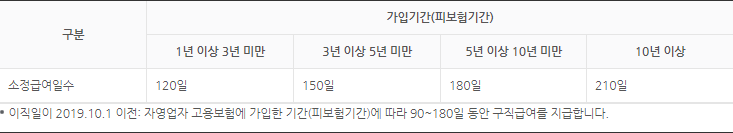 이직일이 2019.10.1 이후 자영업자 고용보험에 가입한 기간 (피보험기간)에 따라 120~210일 동안 구직급여를 지급합니다. 또한 폐업 후, 구직급여 수급 없이 일반 근로자 (임금근로자)로 전환하는 경우에는 실업급여 수급에 불이익이 없도록 자영업자 고용보험 가입기간을 합산해 드립니다. 또한 일반 근로자에서 자영업자로 전환되는 경우는, 본인이 희망하는 경우에 한해 고용보험 가입기간을 합산해 드립니다.