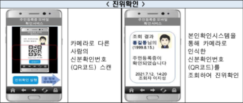 정부24를 통해서 본인확인 절차를 거친 후 신분확인번호(QR코드)를 수신하여 주민등록증 수록사항을 화면에 표시하거나 또는 스캔하여 타인의 주민등록증 진위여부를 확인하는 방식으로 이용하게 됩니다.