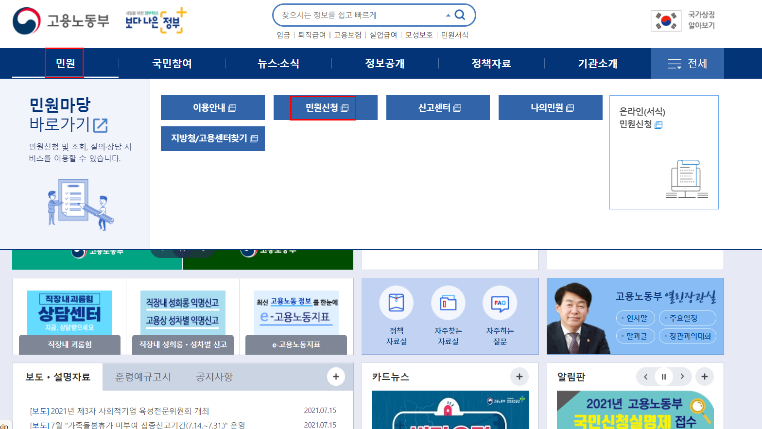 고용노동부 누리집 홈페이지에 접속하신 후 민원 → 민원신청을 눌러주세요.