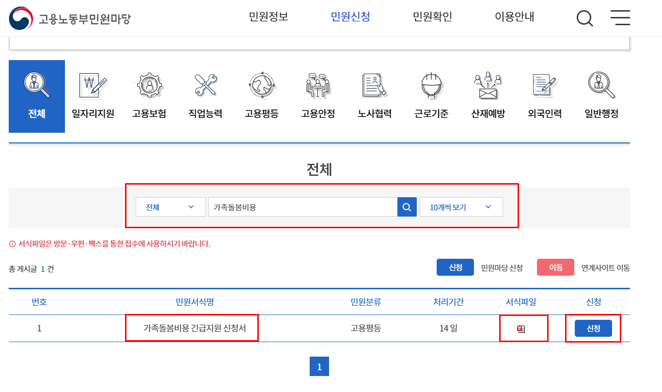 고용노동부 누리집 홈페이지 → 민원 → 민원신청 → 가족돌봄 검색 → 신청서 작성 및 제출