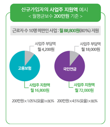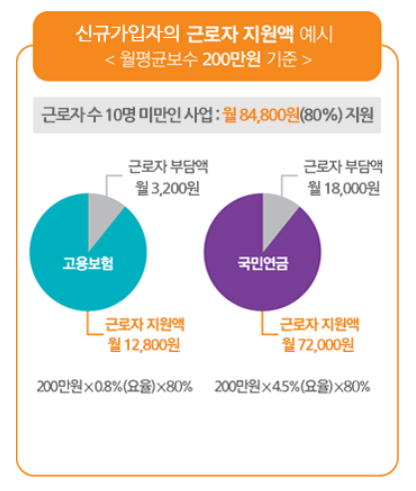 - 지원 혜택은 신규 가입자에 해당하는 근로자만 고용보험료의 80%를 지원합니다.