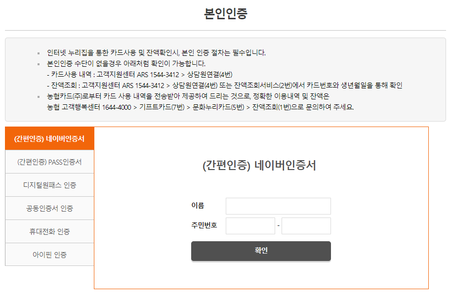 2. 본인 인증수단을 통해서 인증 후 확인이 가능하며, 본인 인증수단이 없을 경우 하단의 내용을 참고해주세요. 별도로 해당 서비스는 농협카드(주)로부터 카드 사용 내역을 전송받아 제공하는 서비스로 정확한 이용내역 및 잔액은 농협 고객 행복센터 1644-4000 → 기프트카드 7번 → 문화누리카드 5번 → 잔액조회 1번으로 문의해주세요.