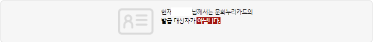4. 카드 발급 자격 검증을 클릭하시면 본인이 신청대상인지 여부 확인이 나옵니다. 만약 본인이 대상자가 아니면, 다음과 같은 화면이 나오고 신청 대상자 일 경우에는 바로 신청서 작성으로 넘어가서 신청서 작성을 해주시면 됩니다.