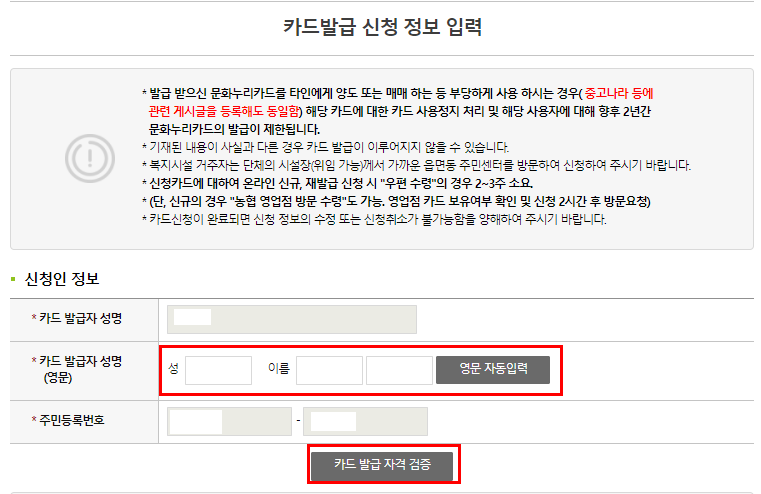 3. 본인 인적사항 확인 및 카드 발급자 성명(영문) 입력해주시고, 카드 발급 자격 검증을 클릭해주세요.